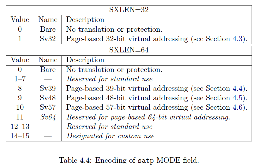 Mode 为0, MMU 关闭。 我自己的qemu环境默认采用的是Sv57模式,即mode值为 10。