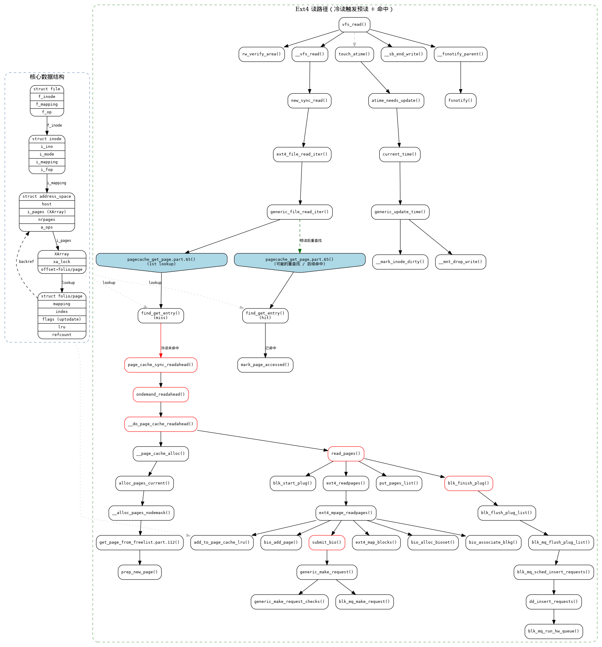 1. 冷读触发预读:page_cache_sync_readahead() 一次性分配多个页并通过 ext4_readpages 批量读取。