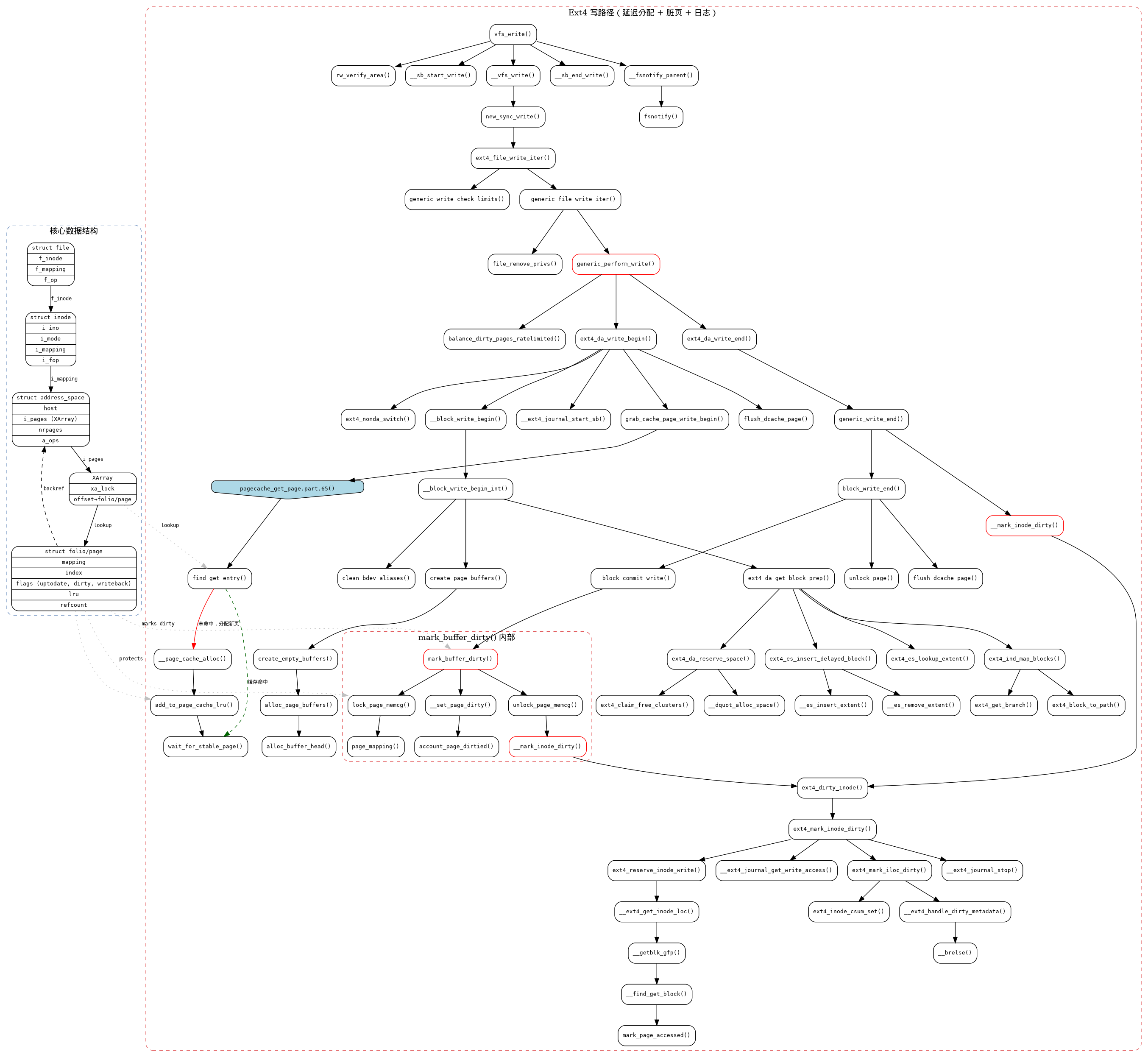 - ext4 使用 延迟分配策略:写入只标记页脏并记录日志,不立即下发 I/O。